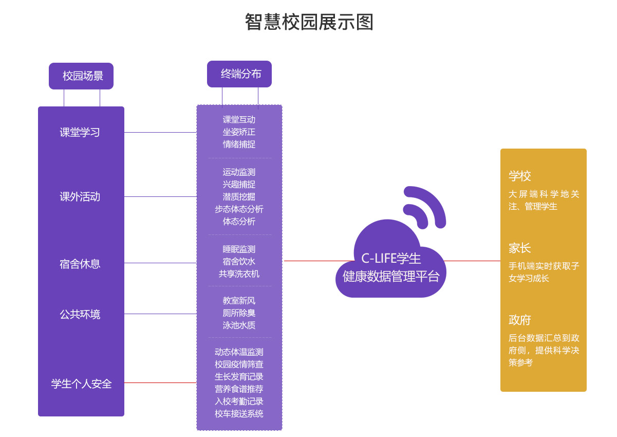 智慧校園管理平臺由是分布在校園內(nèi)的物聯(lián)網(wǎng)數(shù)據(jù)采集終端搭建的一種可感知、可診斷、可分析、可自愈、基于健康、安全、教育、環(huán)境、管理等多維一體的移動互聯(lián)的新型校園生態(tài)。數(shù)據(jù)采集終端將校園學(xué)習(xí)生活的各個場景激活,記錄學(xué)生在學(xué)校學(xué)習(xí)、生活的數(shù)據(jù),并通過對多維度的計算、深度分析,建立精準(zhǔn)的學(xué)生健康成長模型。并將這些數(shù)據(jù)共享給家長、學(xué)校、政府,三位一體,共同關(guān)注學(xué)生健康成長。